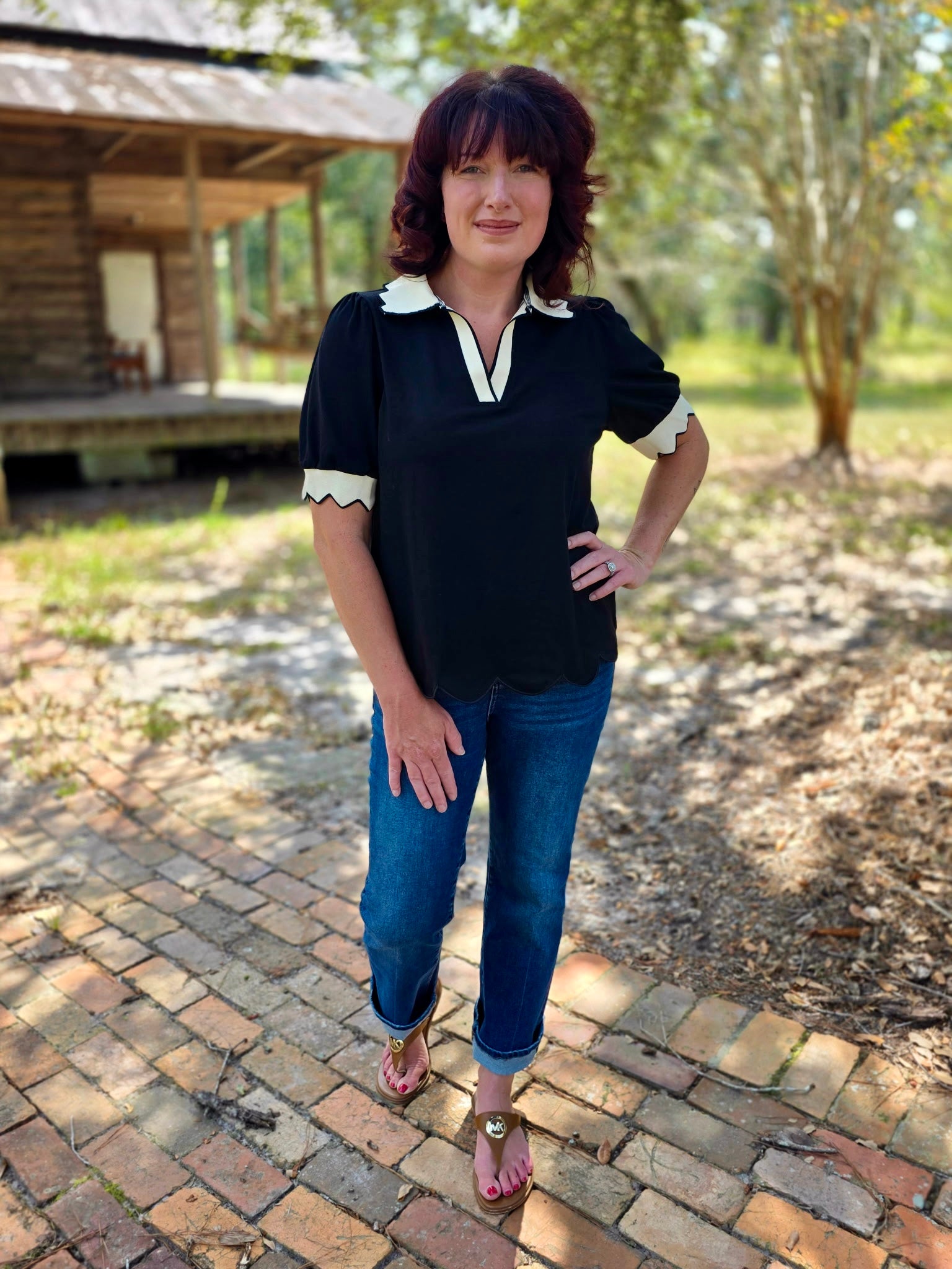 Sophisticated with a touch of charm, this Contrast Collar V-Neck Puff Sleeve Blouse is the perfect piece to elevate your everyday style. Designed with puff sleeves and delicate scalloped trim, the cream contrast collar and cuffs bring a refined finish to the classic black silhouette. Pair it effortlessly with denim for a chic casual look or dress it up with tailored pants for the office.