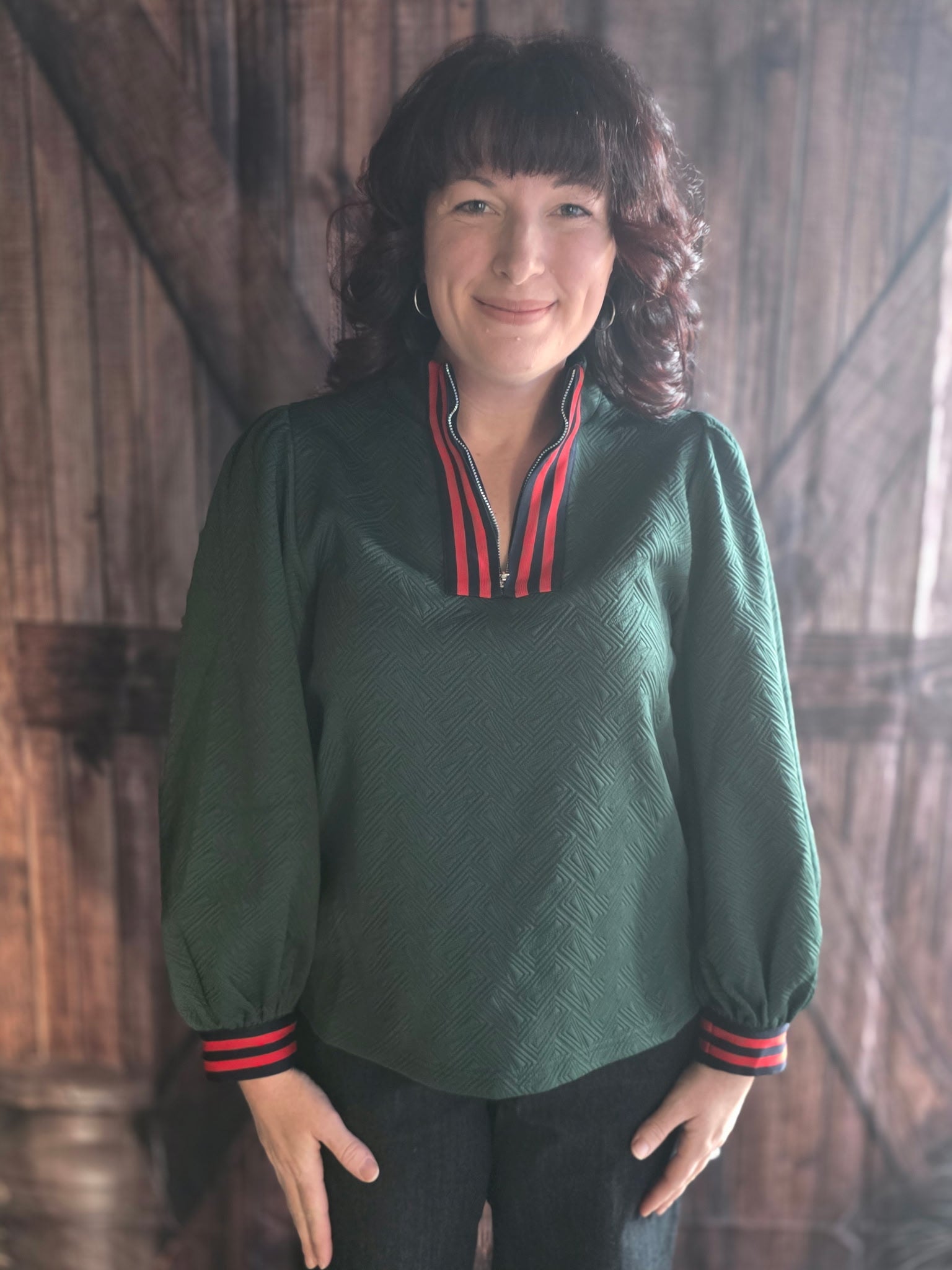 This hunter green knit long-sleeve top combines classic color with sporty detailing. Designed with a front zipper at the neckline, it features navy blue and red striped accents along the zipper border and at the sleeve cuffs for a bold, refined contrast. The knit construction offers comfortable warmth while maintaining a clean, polished look, making it a versatile piece that transitions effortlessly from casual wear to elevated everyday styling.