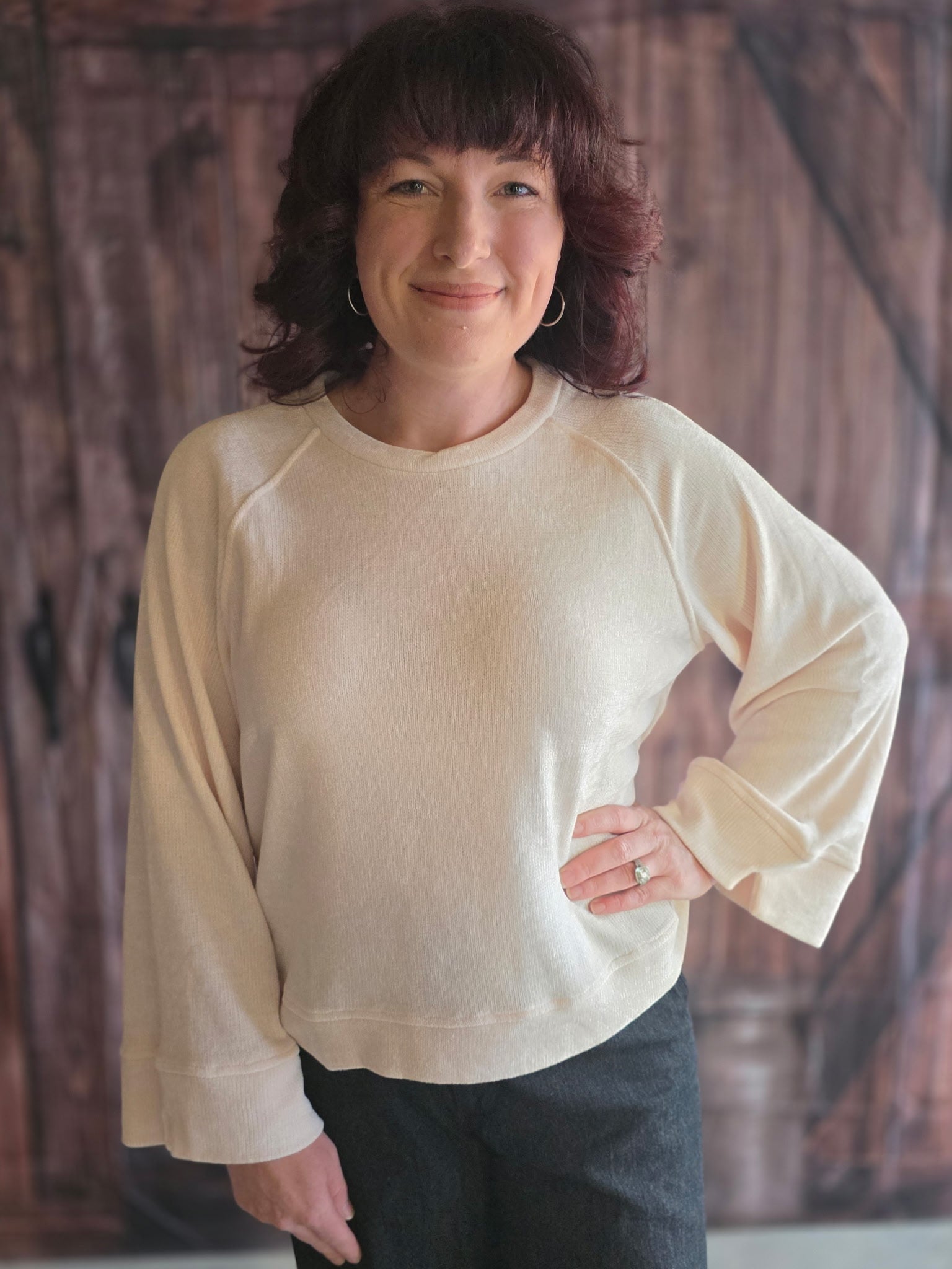 Model is 5’ 5” and wearing a Small. Top has a relaxed fit.