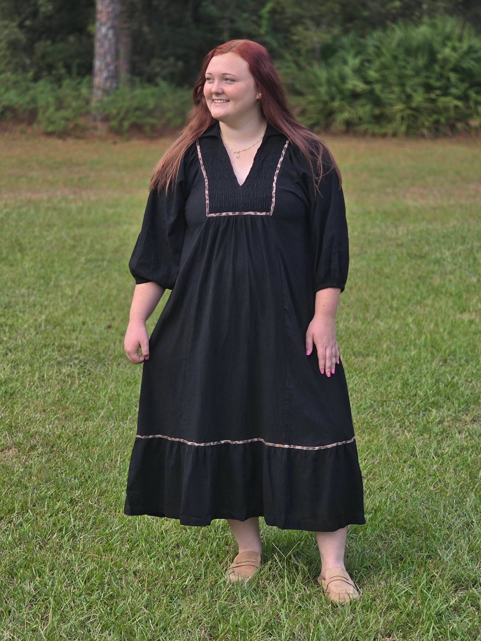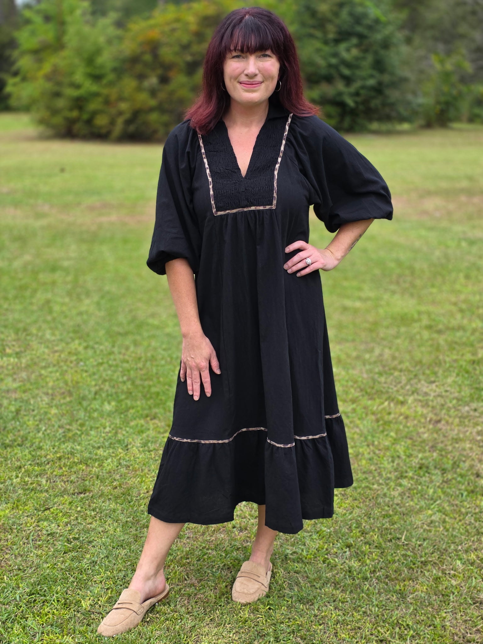 Elevate your wardrobe with this effortlessly chic dress, designed to make a statement while keeping things timeless. Featuring a flattering V-neckline and a structured collared design, this dress combines classic tailoring with contemporary flair. Bold animal print contrast details add just the right amount of edge, creating a standout look that’s both playful and sophisticated. Crafted with an unlined finish, it offers a lightweight, breathable feel—perfect for transitioning between seasons. Dress it up with heels for a night out or keep it casual with sneakers or boots for daytime style.